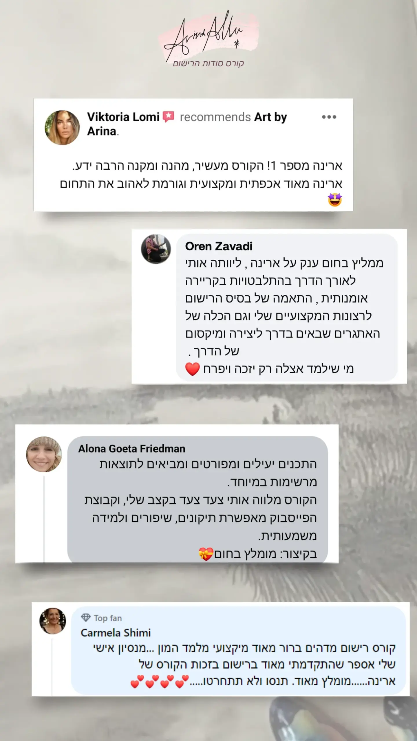 מאז הצגתי במוזיאונים באירופה, בניתי קהילה של עשרות אלפים חובבי אמנות, ופתחתי את קורס "סודות הרישום" – כדי שגם אתם תוכלו לעבור את השינוי הזה, להצית מחדש את היצירתיות, ולגלות את האמן שבכם.